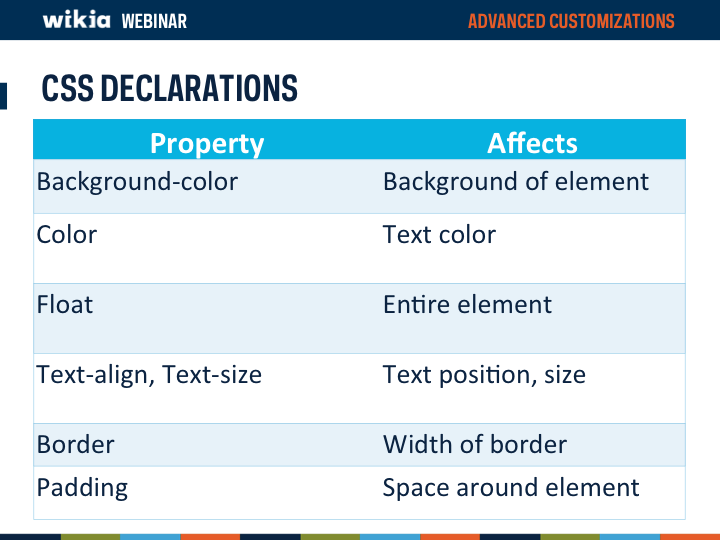 To get started you need to go to your wiki’s Wikia.css page. I recommend choosing just a couple of elements to start with, and adding complexity as you become more experienced with CSS. To start, research what the HTML codes are for your selectors, as well as choose what declaration you plan to make. You can look up what declarations are possible at http://w3schools.com, where you can see all of the possible CSS values and test for yourself.