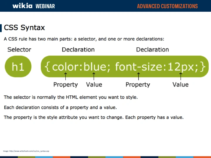 In this slide, the selector is an H1 Headline, and the declaration includes the property color, which defines the text color, with a value of blue, and a property of font size, with the value of 12 pt. This will mean that whenever there is a h1 header on this wiki, it will be displayed as blue text in 12 pt font.