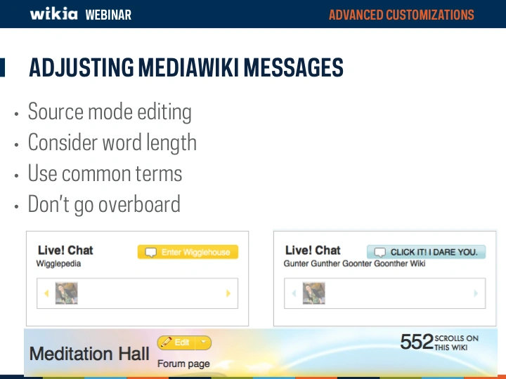 Common messages to adjust are: Welcome messages, Community Corner, Chat headlines, and User masthead titles. When adjusting a MediaWiki message, keep in mind the following: