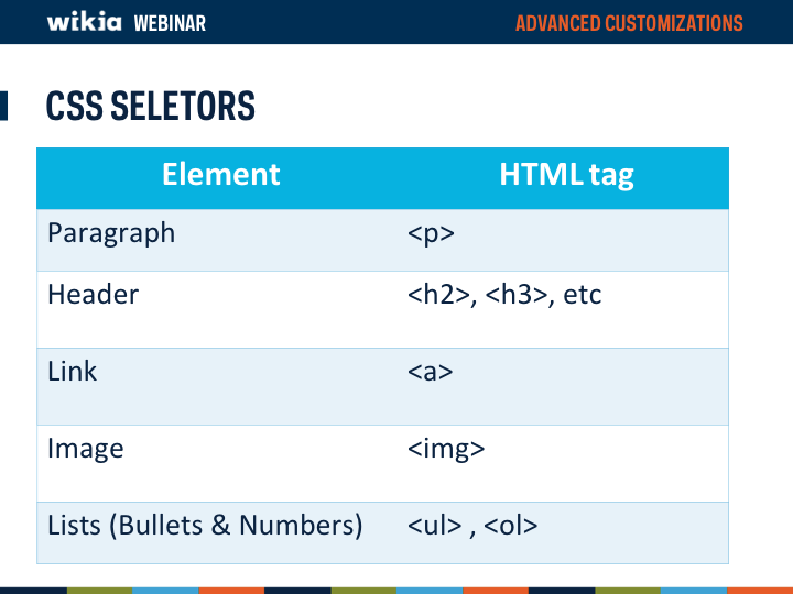 So lets look now at selectors. Selectors can be any HTML element - a paragraph, a header, links, images, bulleted or numbered lists - or essentially anything that exists within structure of a web page. Each selector uses a specific HTML tag, which you need to know in order to use. The table here shows common HTML tags you will see on used on wikis.