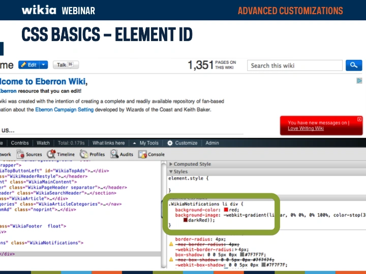 - In the screenshot here we are using a developer tool to look at what element id is being used to color the wikia notification bubble