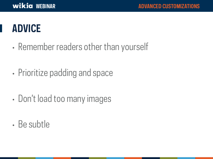 - Focus on readability - people come to your wiki to view the content your community has added - if they can’t read the page, they won’t be able to enjoy.