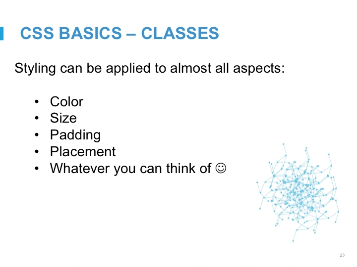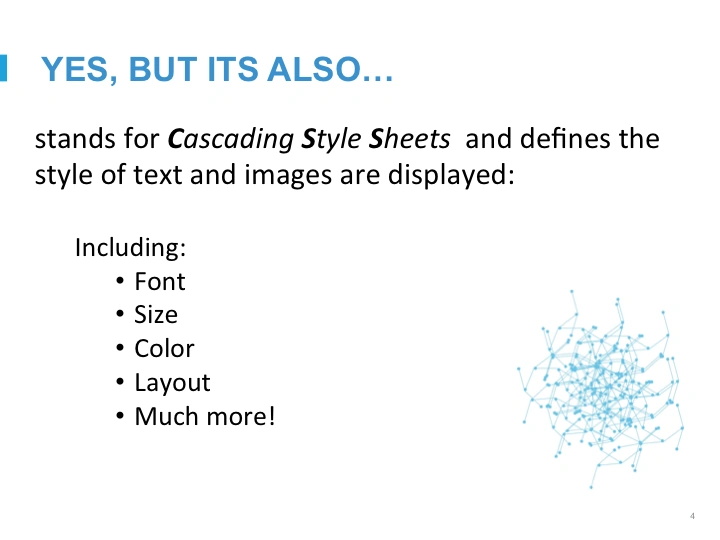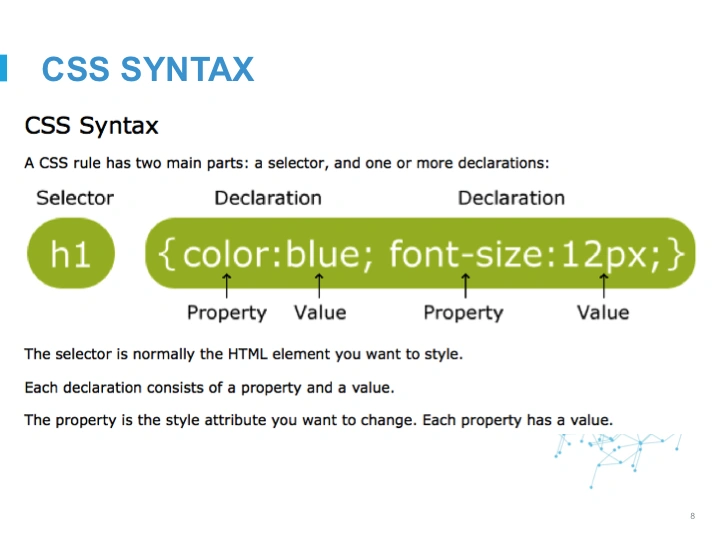 - In this slide, the selector is a header and are declaring that the color of the header will show as blue.