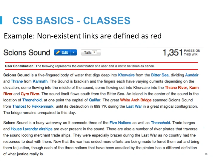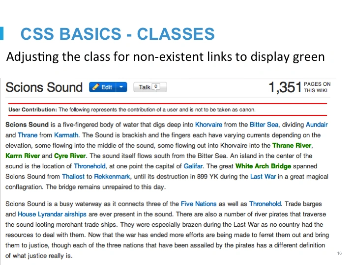 So lets use a basic example that you likely have seen across wikia, the class that includes links to non-existent pages. By default on Wikia, we use css to style that class to say that those links should appear as red.