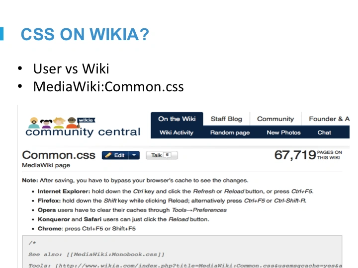 So where can you use CSS on your wiki? You can set up your own personal CSS which will apply to all wikis you visit or if you are an admin, you can edit your wiki’s CSS page. This will apply only to your wiki and to do so you edit the Mediawiki:Common.css page on your wiki. In this webinar we are going to focus on modifying this page and tips for the best way to do that.