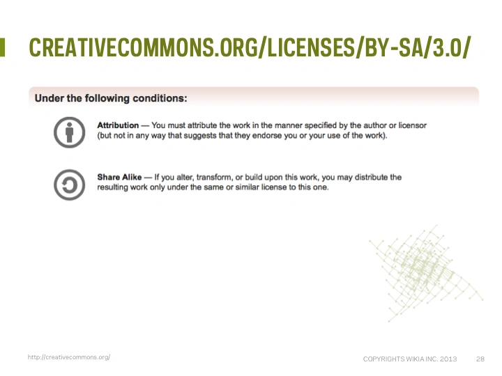 CC-BY-SA = type of license, gives free permission but adds stipulations What you are able to do?