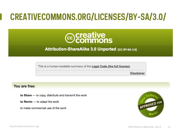 Creative Commons - a nonprofit organization dedicated to providing easy ways for people to share and use their knowledge and creativity while reserving some of the standard protections of copyright (Wikia webinar with Creative Commons)