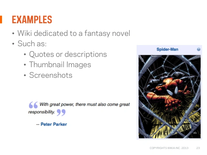 - Making discrete connections between similarly situated subjects: adding info from Marvel Wiki to Captain America wiki and vice versa.