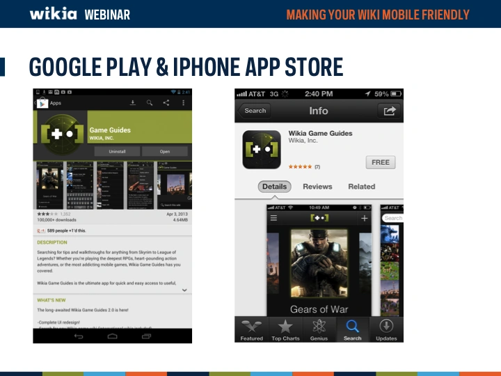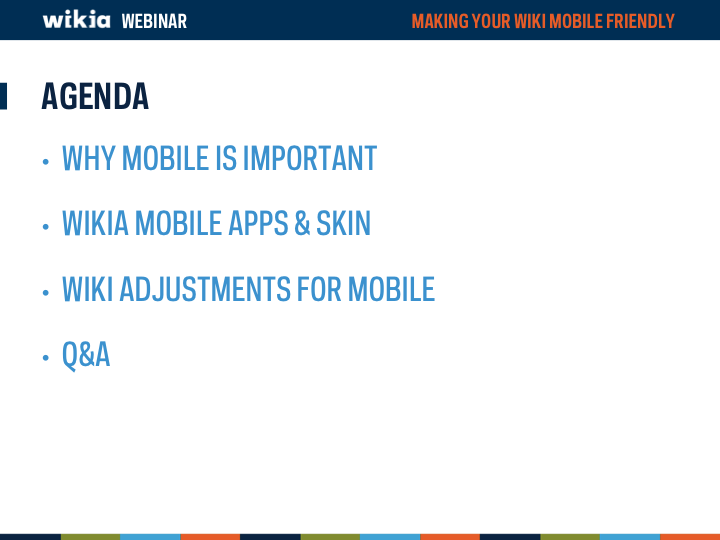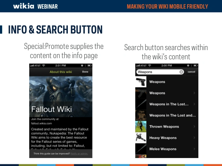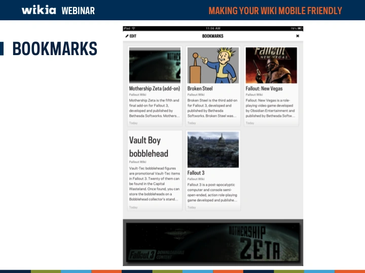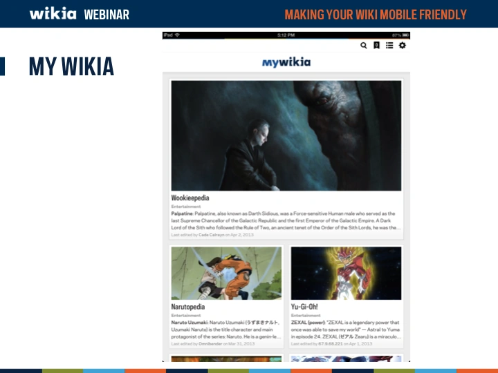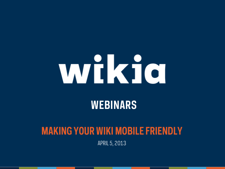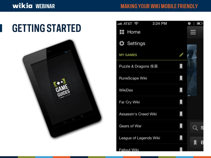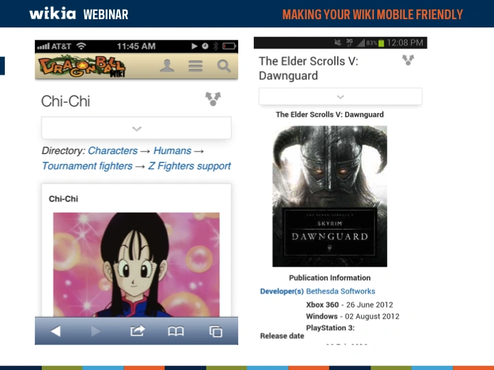 Mobile devices are becoming more and more a major way of how the world views your wiki. But is your wiki optimized to look good on a mobile device? This webinar overviews Wikia's unique mobile apps (Game Guides and My Wikia) as well asĀ now to modify your wiki to look and function better on a mobile device.