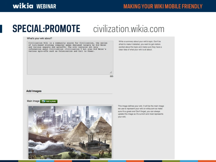 - Complete your wiki's Special:Promote page. Choose a high quality main image and write a good synopsis of your wiki.