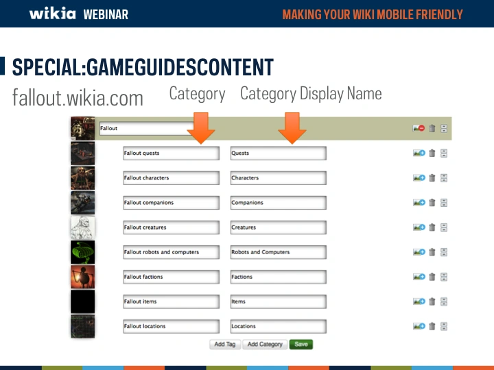 This is a screenshot from the fallout wikiās Special:GameGuidesContent page. You can see in the top row it says fallout. This upper level row is called a tag, and is what appears on the top level of the content list in the fallout wikiās game guide. This can be be adjusted to any free form text, but we recommend it include a upper level term, like the game series installments, walkthroughs or something similar. Tags include category groups, and you can add a new tag at the bottom of the page.