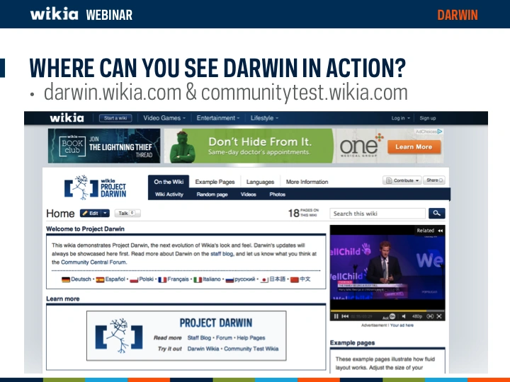 Aired September 20, 2013 This Wikia webinar introduces project Darwin, an extensive redesign of the Wikia platform.