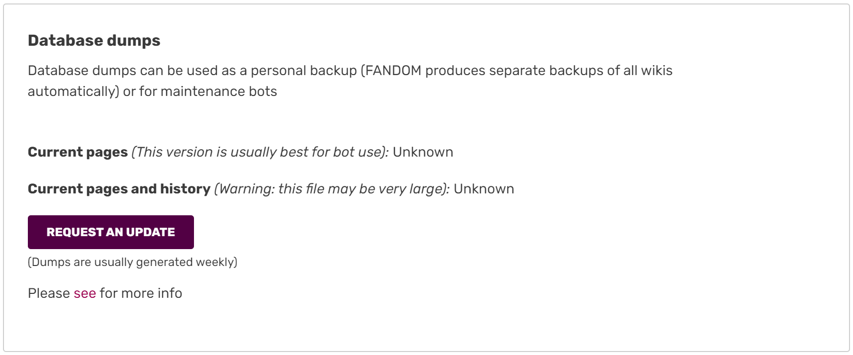 If the latest dump isn't sufficient, or there is no database dump available, a new dump can be requested by an administrator on the wiki by clicking the "Request a database dump" button. This will file a request to have the public XML dump updated. These requests are processed during off peak hours and are usually cleared out weekly. Once the request is processed, the date of the download links will update. A new request can be performed once per week. You can also request a new database dump via Special:Contact.