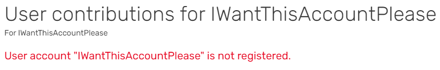 If the name hasn't been taken yet, you should see a message in red text reading: "User account "NAME" does not exist or has never logged in on this wiki."