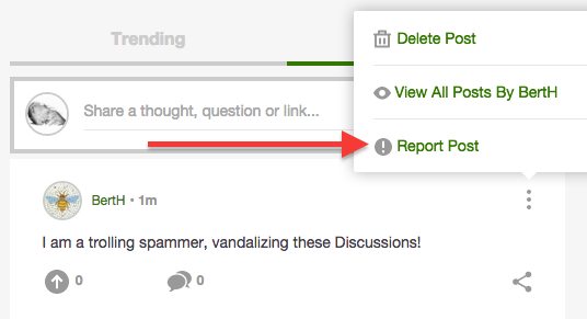 If you encounter inappropriate content (such as spam or vandalism) you can choose to report the post or reply for review, via the 'Report' option on the 'More' menu.