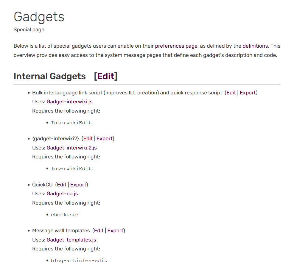 These defined pages will allow the gadget to appear in the "Gadgets" section of everyone's preferences, so users can choose which gadgets fit their community's needs. An overview of added gadgets can be found on Special:Gadgets, along with links to the respective pages that define them, which allows for better control over the wikis's gadgets.