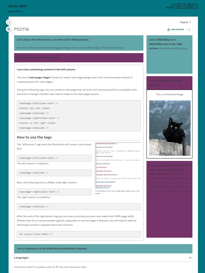 Using the following tags, you can create a main page that will work with FANDOM ads and will be compatible with future changes FANDOM may need to make to the main page layouts.