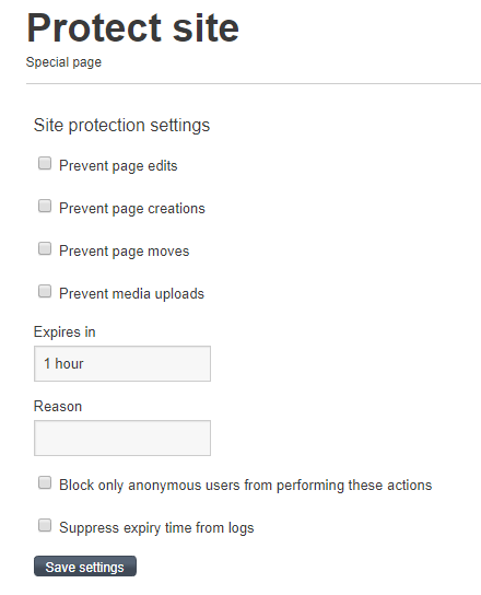 Protect site is an extension that allows Fandom Staff, the Volunteer Spam Task Force, and other volunteers to temporarily restrict certain actions on a community to stop major instances of spam or vandalism. Local administrators can request that the extension be enabled for their use, though it is generally only enabled on communities that have an extensive history of spam or vandalism attacks.