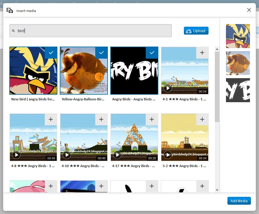 - Search the community for existing images and videos by entering search terms into the field at the top of the media tool. Results will be displayed below the field. Click on one or more images or videos to add them to the 'cart'. Items you've added to the cart will show a check mark