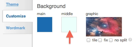If the central split isn't a problem, but you'd like the color inside the split to be different from the color beyond the outer edges of your image, you can do that! There are now two color selection areas available in Theme Designer. The "main" color will show beyond the sides of the image, and most of the bottom area as well. The "middle" color will be the same as the main color by default, but can be changed depending on your needs for the specific background image.