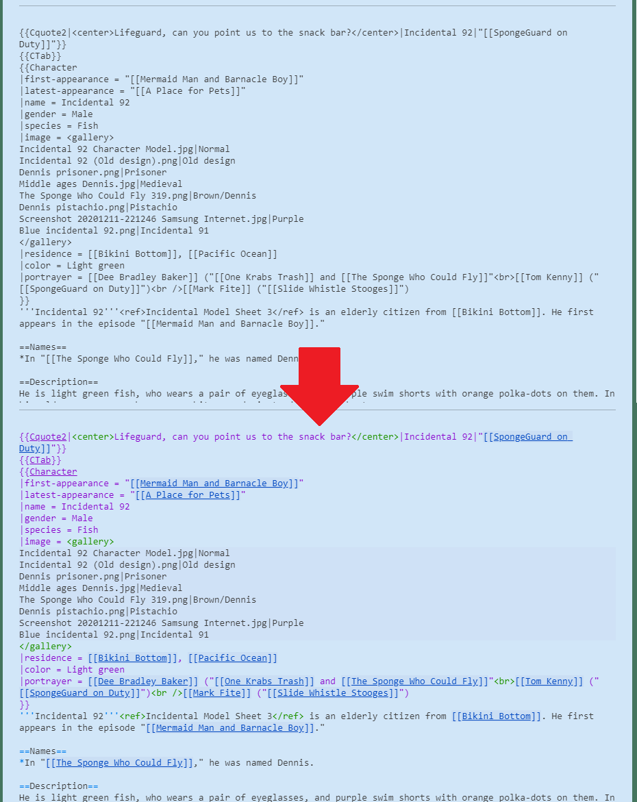 As many of you know, wikitext is the main building block of articles across Wikia, but it can often be hard to comprehend what you're seeing at a glance, especially on more complex pages. We're planning on introducing a feature called 'syntax highlighting', visible when editing the source code of an article, to help make this easier.