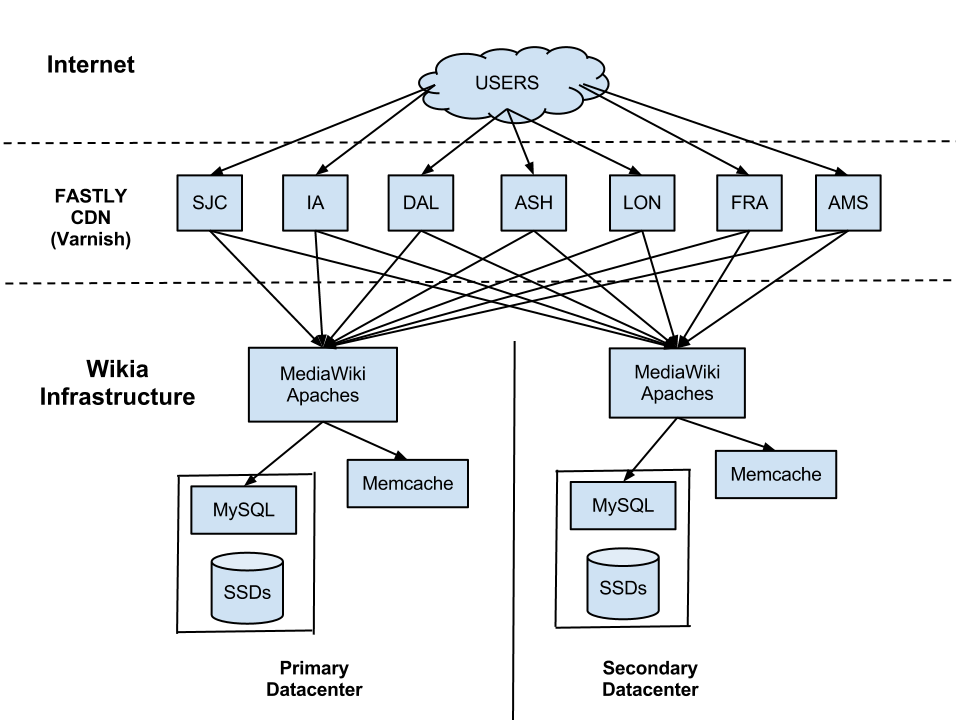 The first stop is to our Content Delivery Network (CDN) which is operated by Fastly (a company founded by former Wikian Artur Bergman). Fastly uses Varnish to deliver you a page from the edge cache. The edge cache contains all the most frequently viewed pages from your region in the last 24 hours.